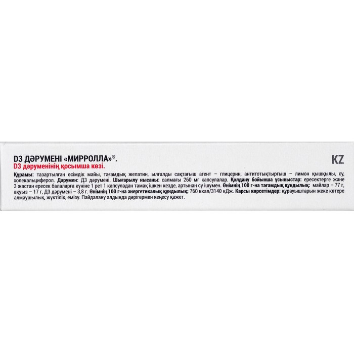 Состав: масло растительное (подсолнечное, рапсовое); оболочка капсулы: желатин пищевой, изготовленный из шкур крупного рогатого скота (жвачных животных)/или свиней, глицерин (влагоудерживающий агент), лимонная кислота (антиокислитель); холекальциферол (витамин D3)