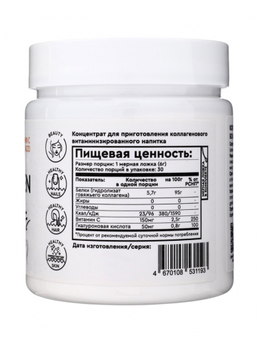 Банка 180 г — концентрат, рассчитанный на длительный курс употребления для поддержания здоровья кожи, волос, ногтей и суставов.