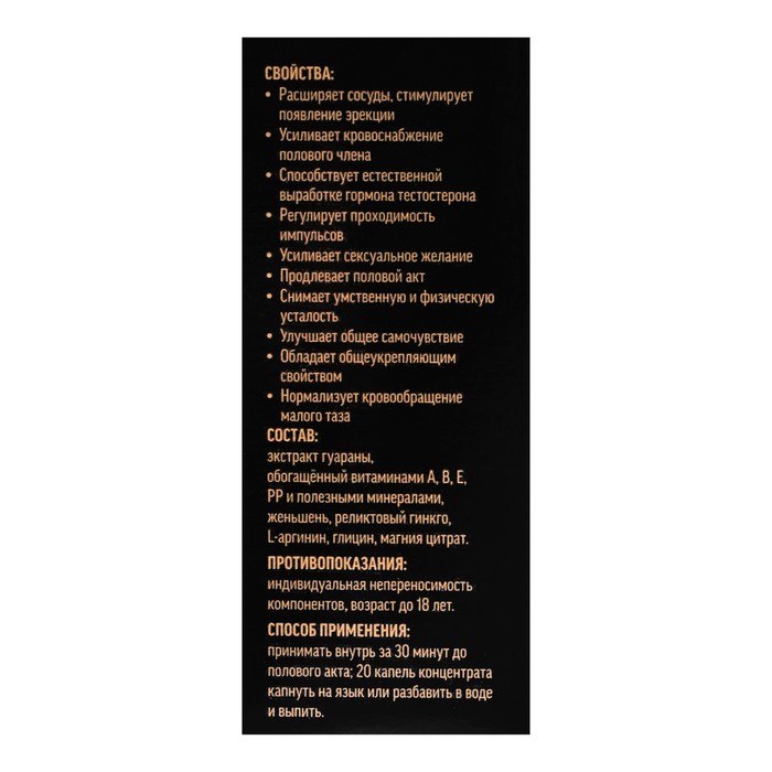 Способ применения: принимать внутрь за 30 минут до полового акта; 10 капель препарата разбавить в воде и выпить или капнуть на язык.