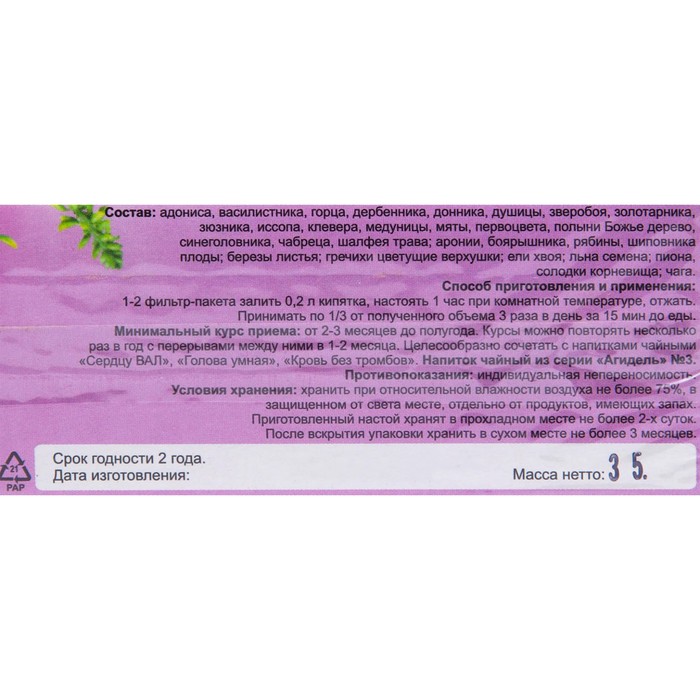 Минимальный курс приема: от 2-3 месяцев до полугода. Курсы можно повторять несколько раз в год с перерывами между ними в 1-2 месяца. Целесообразно с напитками чайными «Сердце здоровое», «Голова умная», «Кровь без тромбов».