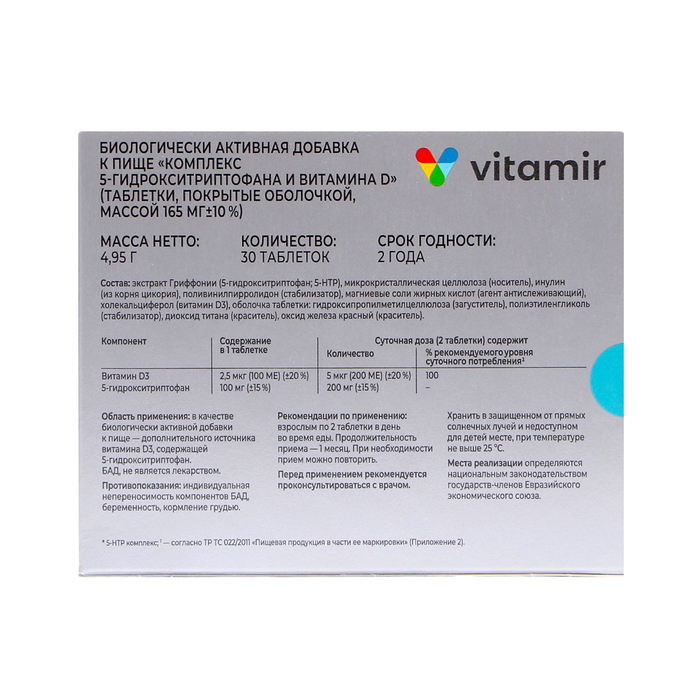 Комплекс 5-гидрокситриптофана и витамина D, 5-HTP, нормализация эмоционального состояния и сна, 30 таблеток