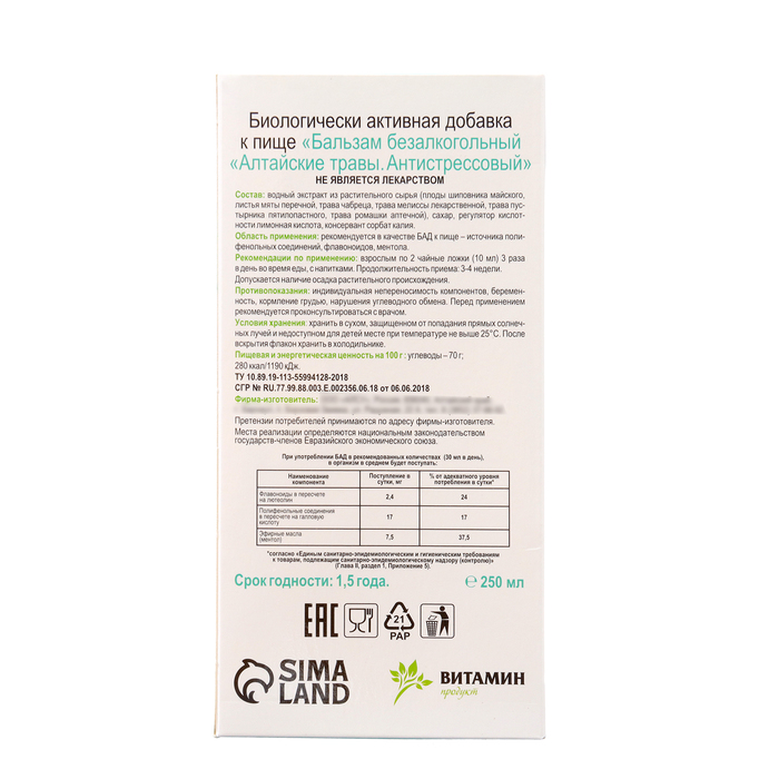Безалкогольный алтайский бальзам на травах Vitamuno «Антистрессовый», стекло, 250 мл