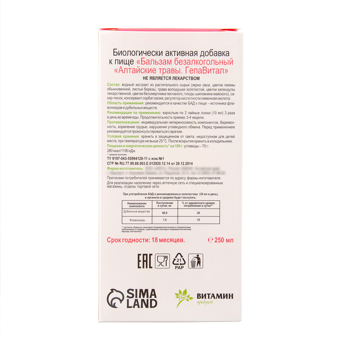 Безалкогольный алтайский бальзам на травах Vitamuno «Гепавитал», в помощь работе печени, стекло, 250 мл