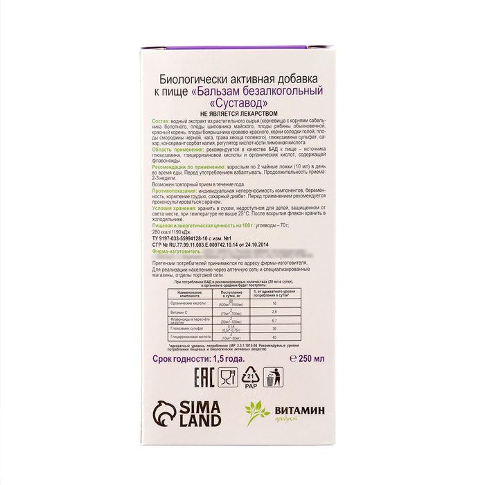 Безалкогольный алтайский бальзам на травах Vitamuno «Суставод», в помощь суставам, стекло, 250 мл