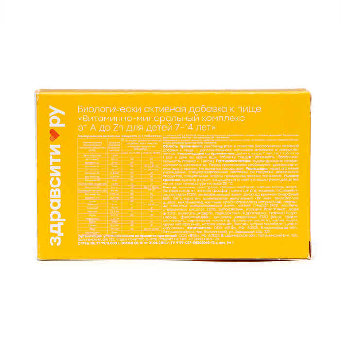 Состав: носитель: декстроза; кальция карбонат; магния оксид; аскорбиновая кислота; железа фосфат; цинка цитрат; носитель: поливинилпирролидон E1201; антислёживающий агент: диоксид кремния аморфный Е551; бета-каротин; ароматизатор натуральный «Вишня» (натуральные вкусоароматические вещества, вкусоароматические препараты; носитель); токоферола ацетат; никотинамид; носитель: кроскарамеллоза натрия Е468; марганца глюконат; антислёживающий агент: магния стеарат Е470; носитель: кислота стеариновая Е570; рибофлавин; кальция пантотенат; меди цитрат; холекальциферол; пиридоксина гидрохлорид; тиамина гидрохлорид; фитоменадион; краситель натуральный Е120 (вода, пропиленгликоль, карминовая кислота); кислота фолиевая; калия йодат; хрома аспарагинат; натрия селенит; биотин; натрия молибдат; цианокобаламин.