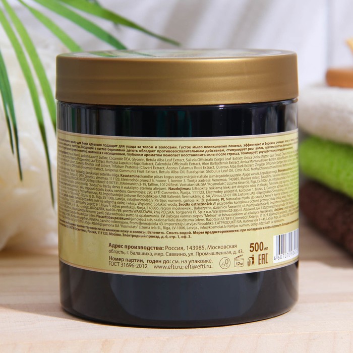 Состав: березовый деготь, эфирное масло эвкалипта, водные настои березы и шалфея, крапивы, мяты и ромашки, календулы, арники и хмеля, алоэ-вера и мальвы, зверобоя, аира, розмарина и зеленого чая, клевера и коры дуба, кедра, имбиря и можжевельника.