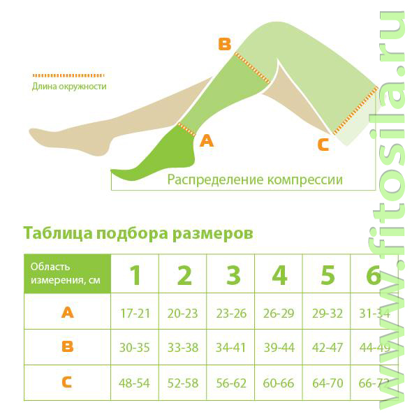 Для определения подходящего размера необходимо измерить ногу в районе лодыжки (А), икры (В) и бедра (С) и подобрать размер согласно таблице: