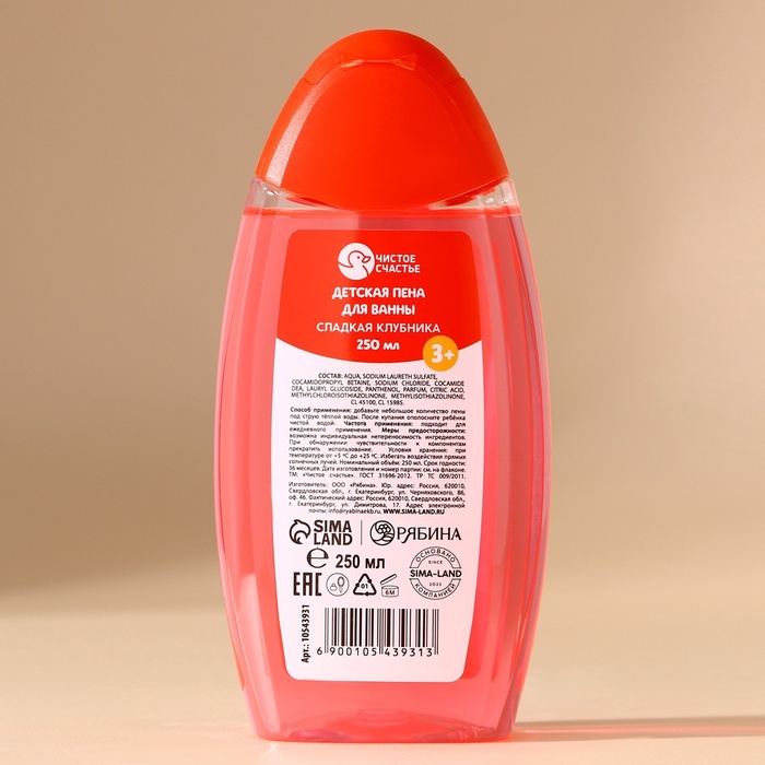 Пена для ванны детская, 250 мл, аромат сладкой клубники, Чистое счастье
