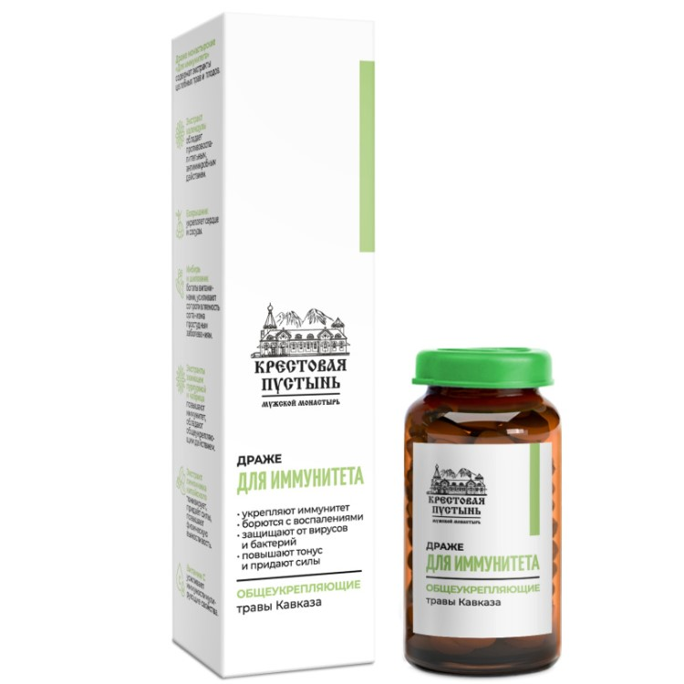 Драже монастырские «Для иммунитета» содержат натуральный кавказский мёд, экстракты целебных трав и плодов. Экстракты ромашки, шалфея и календулы обладают противовоспалительным, антимикробным действием. Боярышник укрепляет сердце и сосуды. Имбирь