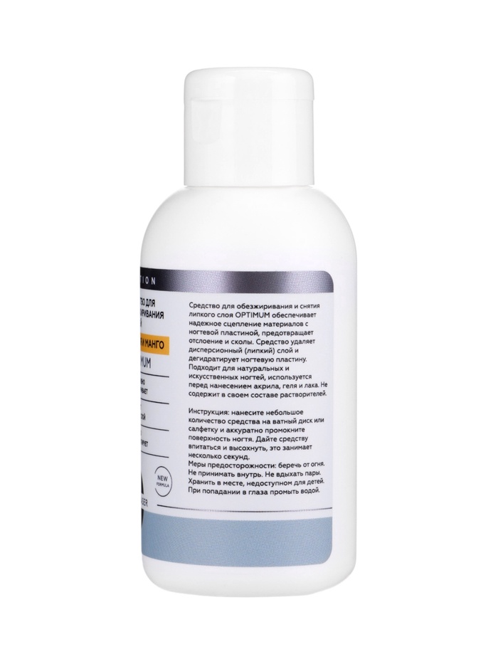 ESTELICA PROFESSIONAL OPTIMUM «Дыня и Манго», средство для обезжиривания и снятия липкого слоя 100 мл — профессиональное средство, обеспечивающее надёжное сцепление материалов с ногтевой пластиной и предотвращающее сколы и отслоения покрытия. Эффективно удаляет дисперсионный (липкий) слой и дегидратирует ногтевую пластину, что делает его незаменимым при работе с натуральными и искусственными ногтями перед нанесением акрила, геля или лака.