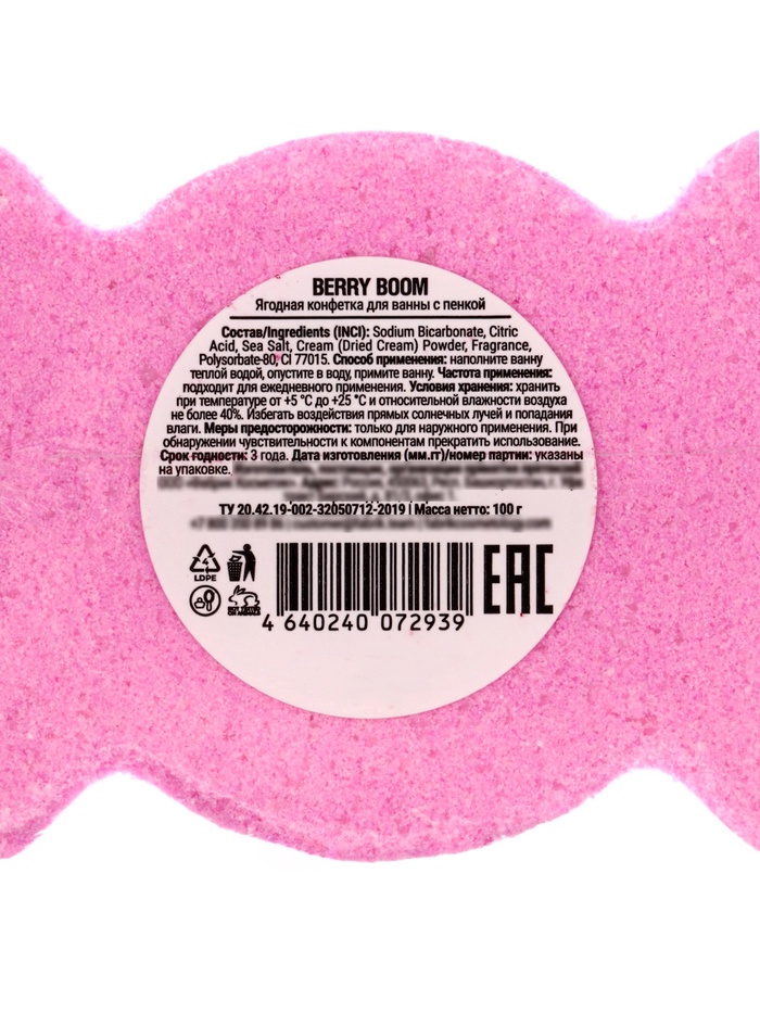 Ягодная конфетка для ванны с пенкой «Berry Boom» FABRIK Cosmetology, 100 г — это маленький праздник в вашей ванной. При соприкосновении с водой конфетка бурлит, создавая нежную пену, наполняет ванную ароматом сочной клубники и превращает купание в весёлое и ароматное приключение. «Berry Boom» подарит радость, положительные эмоции и сладкий ягодный аромат.