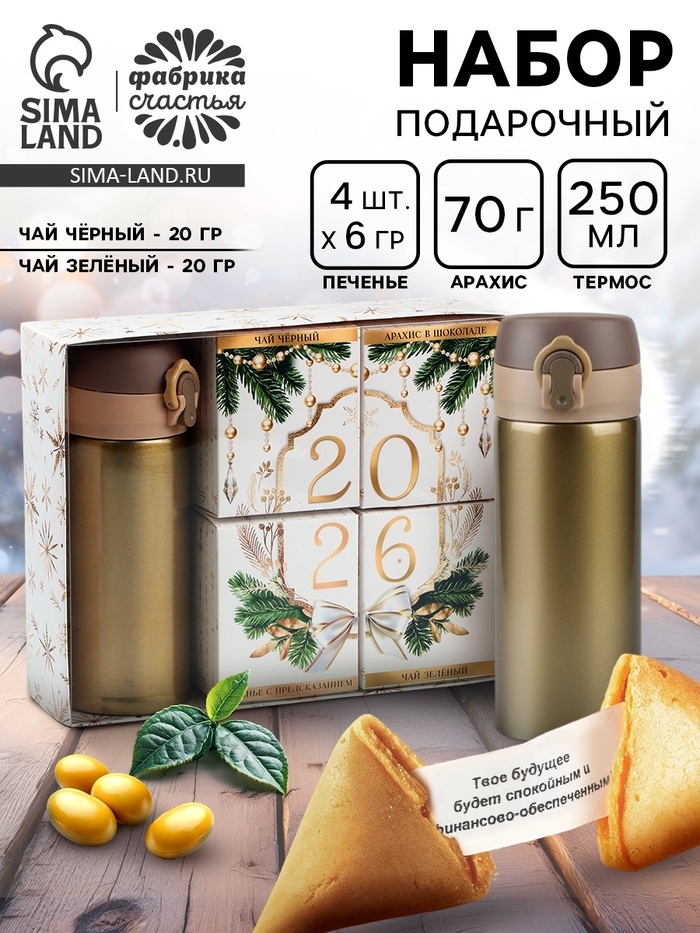 Подарочный набор новогодний «Новый год 2026»: термос, чай чёрный/зелёный, печенье с предсказанием, арахис в шоколадной глазури
