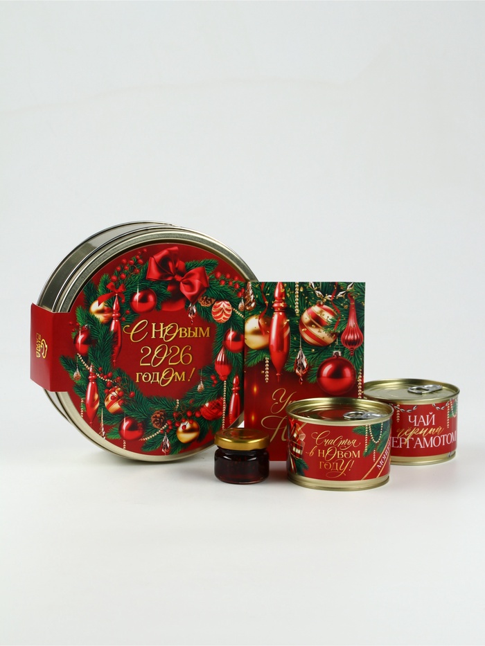 Подарочный набор новогодний «С Новым 2026 годом» в железной банке: чай, монпансье, варенье, открытка