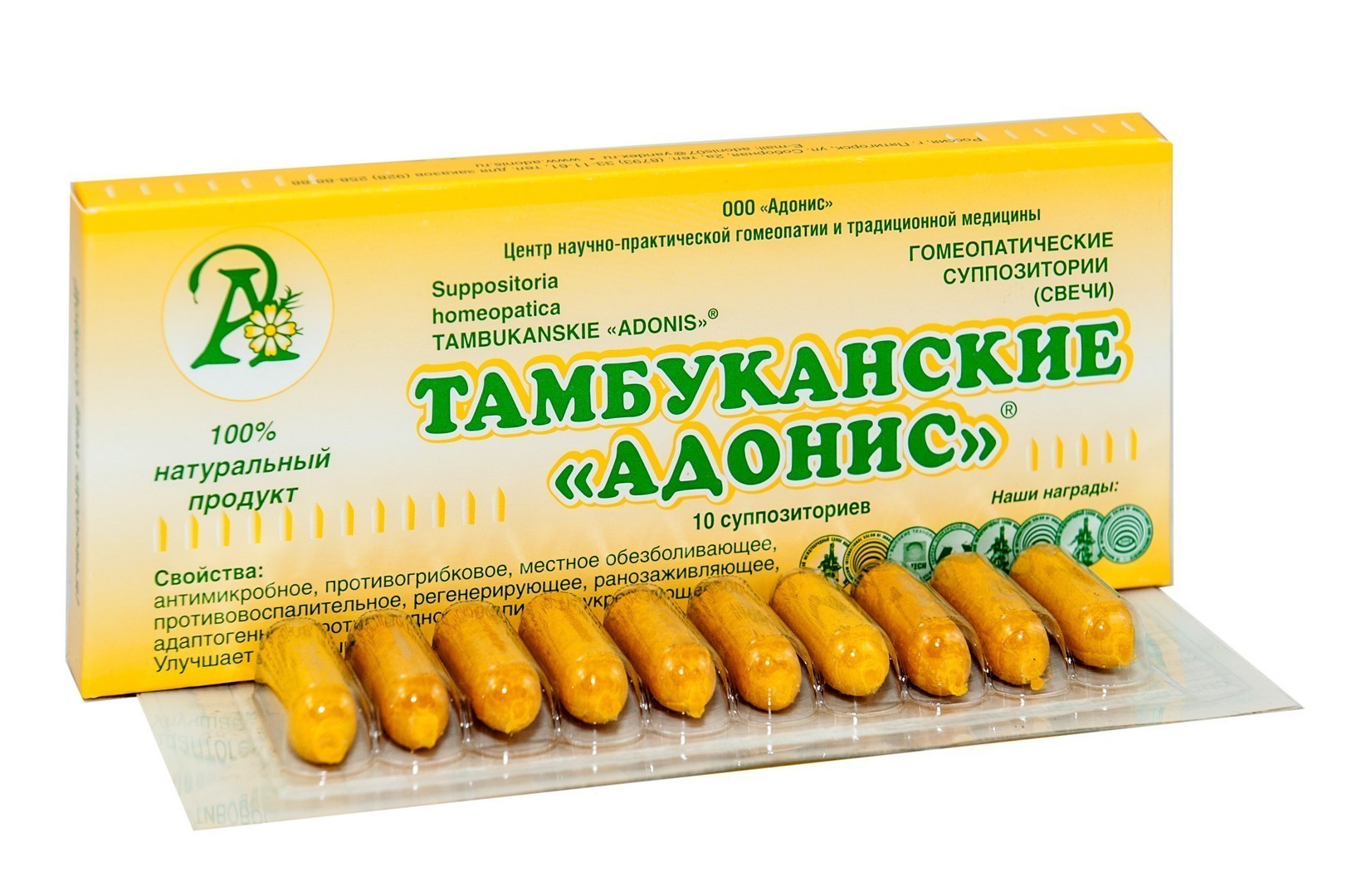 Лекарственная форма : суппозитории(свечи) по 2,0 г. Состав :одна свеча ТАМБУКАНСКИЕ «АДОНИС» содержит: прополис (Propolis) 0,1 г масло облепихи(Oleum Hippophaes) 0,1 г гомеопатическая эссенции: Тысячелистника (Millefolium) 0,1 г Лабазника (Filipendula) 0,1 г экстракт(концентрат) из лечебной грязи озера Тамбукан 0,1 г нативные пелоиды озера Тамбукан 0,1г лецитин (Lecitinum) 0,1 г суппозиторная основа(масло какао) насыщенная прополисом до 2,0 г Показания: воспаления различного происхождения Геморрой, парапроктит, проктосигмоидит, язвы и трещины заднего прохода. Простатит и сопутствующее снижение половой потенции, эрозии, кольпиты, и другие заболевания женской половой сферы сопровождающиеся воспалением . Терапевтическое действие: антимикробное, противогрибковое, местное обезболивающее, противовоспалительное, регенерирующее, ранозаживляющее, адаптогенное, противозудное и капилляроукрепляющее. Улучшает тканевой обмен. Показания к применению и фармакологические свойства отдельных компонентов: прополис оригинальная технология приготовления обеспечивает активное всасывание следствием чего является не только поверхностное, но и внутритканевое многоплановое действие: антимикробное, противогрибковое, местное обезболивающее, противовоспалительное, ранозаживляющее, адаптогенное и противозудное. Убивает микробов, устраняет различные признаки и симптомы воспаления, такие как: краснота, отечность, боль и др. ПОВЫШАЕТ ПОТЕНЦИЮ. Кольпиты, бели, эрозия, метрит, эндометрит, параметрит, аднексит, геморрой, трещины, язвы, простатиты. Лецитина : мембранопротекторное, антиатеросклеротическое, ангиопротекторное, восстанавливающее структуру нервной ткани, улучшающее метаболизм мозга, гепатопротекторное, препятствующее образованию желчных камней, улучшающее функцию почек, улучшающее усвоение витаминов А, D, Е, повышает сопротивляемость организма воздействию токсичных, веществ, стимулирует желчеотделение, способствует всасыванию в кишечнике жирных кислот, стимулирует образование эритроцитов и гемоглобина. Лецитин составляет основу миелиновой оболочки нервных клеток и волокон. Необходим при: умственных и физических перегрузках, функциональных расстройствах ЦНС, сопровождающиеся снижением уровня психической энергии и интеллектуальных функций, травматические поражения и инфекционные заболевания нервной системы, невриты, циррозе, дискинезии желчевыводящих путей, холецистит; заболевания почек; профилактика похмельного синдрома; снижении уровня потенции, косметических программах и др. Лабазник обладает общеукрепляющим, бактерицидным, диуретическим, успокаивающим, мощным противовоспалительным, вяжущим, ранозаживляющим, кровоостанавливающим, желчегонным и антигельминтным действием, усиливает способность печени обезвреживать токсические продукты обмена. Используется как противоязвенное, седативное, вяжущее, ранозаживляющее и кровоостанавливающее средство, ревматизме, подагре, воспалительных заболеваниях почек и мочевыводящих путей и в виде спринцеваний при белях, а также при нервных расстройствах, гипертонической болезни, как антигельминтное средство и для снятия спазма внутренних органов. Миллефолиум антимикробное, антигрибковое, кровоостанавливающее противовоспалительное действие. Кровоточащие, болезненные варикозные узлы с выделением алой кров