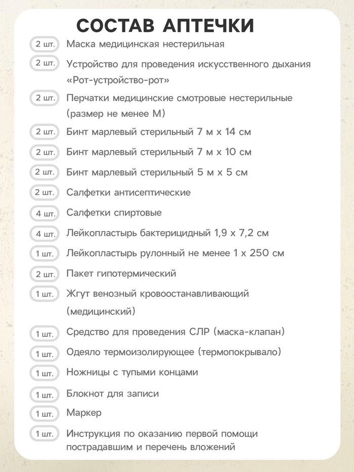 Комплектация: Жгут, Одеяло спасательное изотермическое, Маркер, Блокнот, Перчатки нестерильные, Футляр, Маска одноразовая, Ножницы, Устройство для проведения искусств. дыхания, Бинт нестерильный, Лейкопластырь, Бинт стерильный, Салфетки стерильные, Инструкция по оказанию первой помощи_x000D_