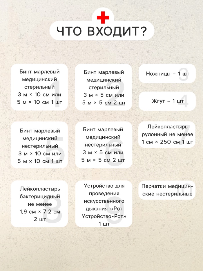 * Соответствие стандартам: аптечка соответствует требованиям ГОСТ РФ, что подтверждает ее качество и эффективность.