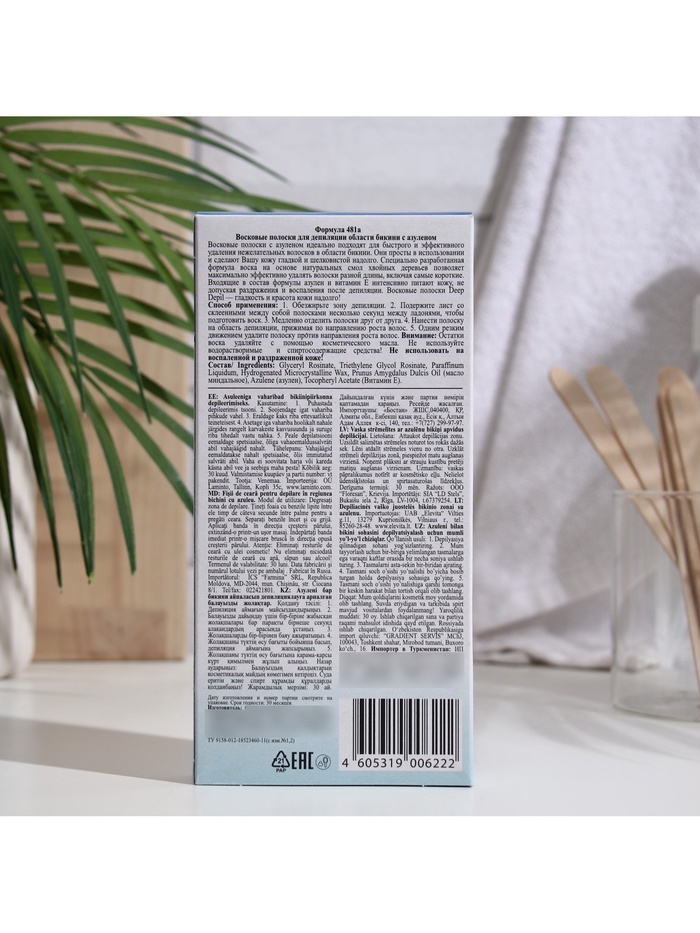 Специальная ткань лишена эластичности, что дает возможность делать короткое резкое движение при отрыве полоски, предотвращая болезненные ощущения. Входящий в состав воска азулен препятствует сухости и шелушению кожи после депиляции.