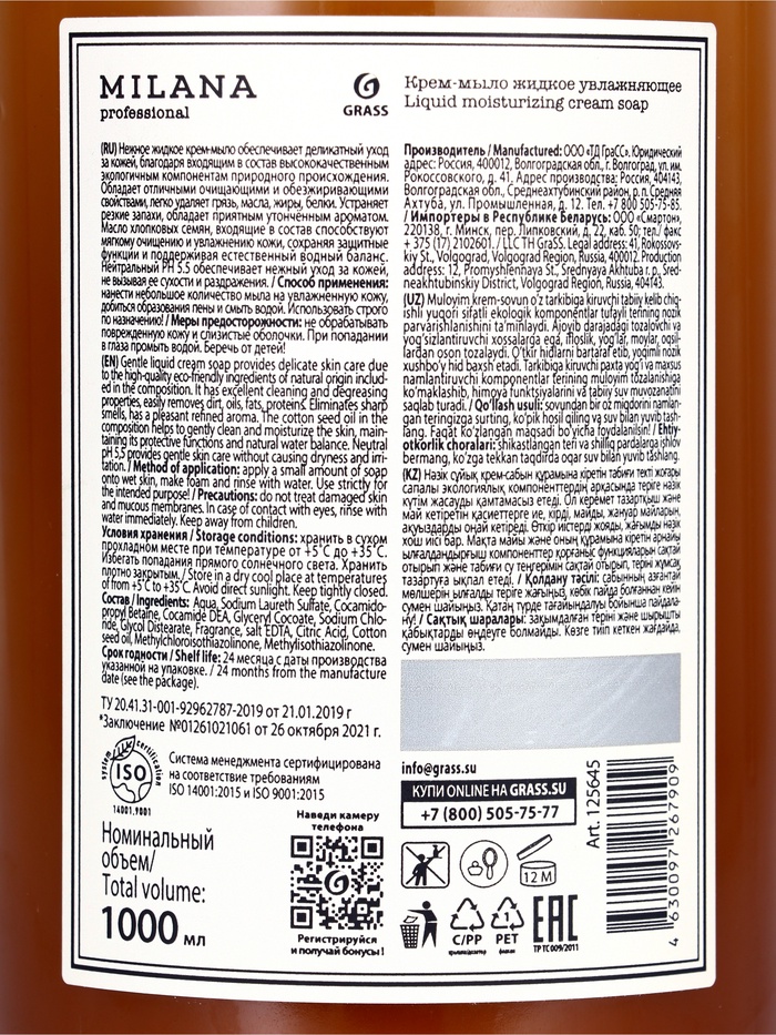 Крем-мыло жидкое Milana Professional увлажняющее, 1 л