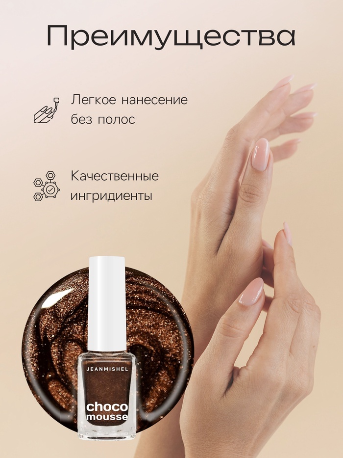 Лак для ногтей коллекции Choco mousse с новыми оттенками шоколадных десертов позволит вам создать нежный стильный маникюр для каждого дня и на любую вечеринку.