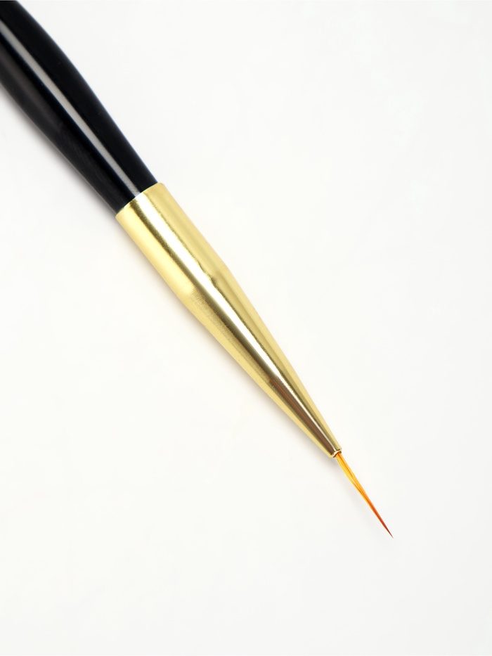 С другой — тонкая дизайнерская кисть, предназначенная для прорисовки мелких деталей, линий, вензелей и художественного декора. Её форма и длина позволяют добиться максимальной точности при создании сложных элементов.