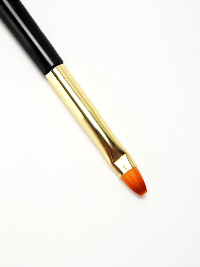 С одной стороны — плотная, упругая кисть с ровным срезом, идеально подходящая для работы с гелем или полигелем. Она обеспечивает чёткую выкладку материала, равномерное распределение по ногтевой пластине и идеальную архитектуру ногтя.