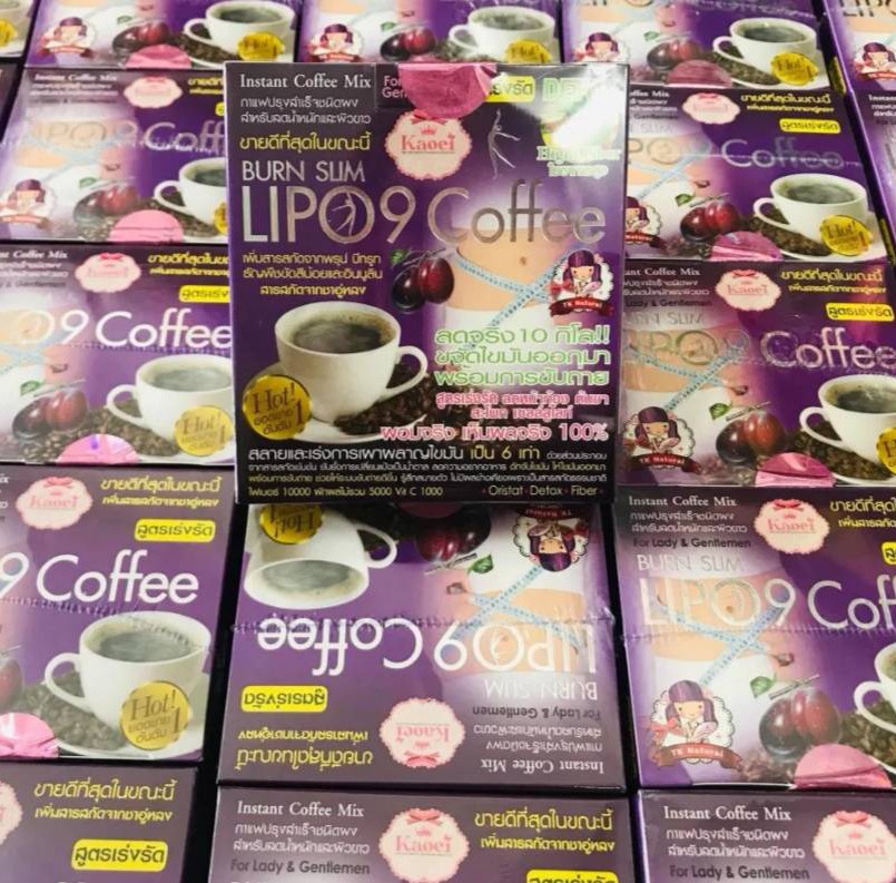 Тайский Кофе Lipo 9 Burn Slim содержит настоящий кофе растворимой формулы, сливки без лактозы, L карнитин, экстракт белой фасоли, экстракт кактуса, полезные фибро-волокна клетчатки, в частности псиллиум (psillium husk). В качестве подсластителя содержит сукралозу.Благодаря содержанию натуральных продуктов кофе не вызывает побочных эффектов.В составе напитка содержатся безлактозные сливки и сукралоза в качестве подсластителя. Поэтому его можно употреблять диабетикам.