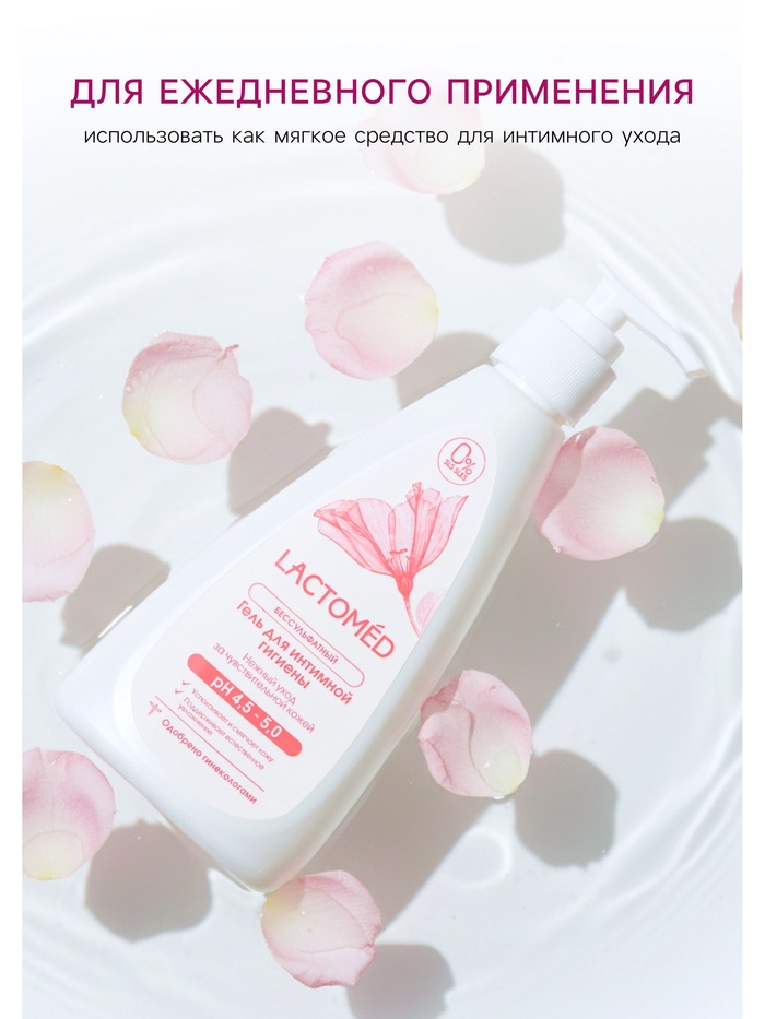 Способ применения: небольшое количество интим-геля нанести на влажную кожу, вспенить, затем тщательно смыть тёплой водой. Подходит для ежедневного ухода.