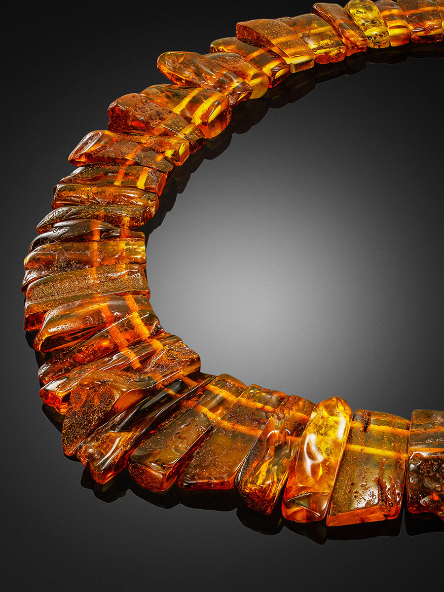Яркое плоское колье создано из натурального цельного балтийского янтаря с красивой природной текстурой. Это оригинальное эффектное украшение понравится всем любительницам необычных и броских аксессуаров, поклонницам этнического стиля, а также тем, кто ищет в изделиях не только красоту, но и практическую пользу. Колье обладает всеми полезными свойствами, которыми так славится янтарь. Оно оказывает положительное воздействие на здоровье (подробнее о лечебных свойствах янтаря), а также позитивно влияет на эмоциональное состояние человека. Такое украшение отлично впишется и в повседневные, и в этнические образы, а самые смелые особы могут надевать его даже к дополнение к вечерним нарядам с открытыми плечами.