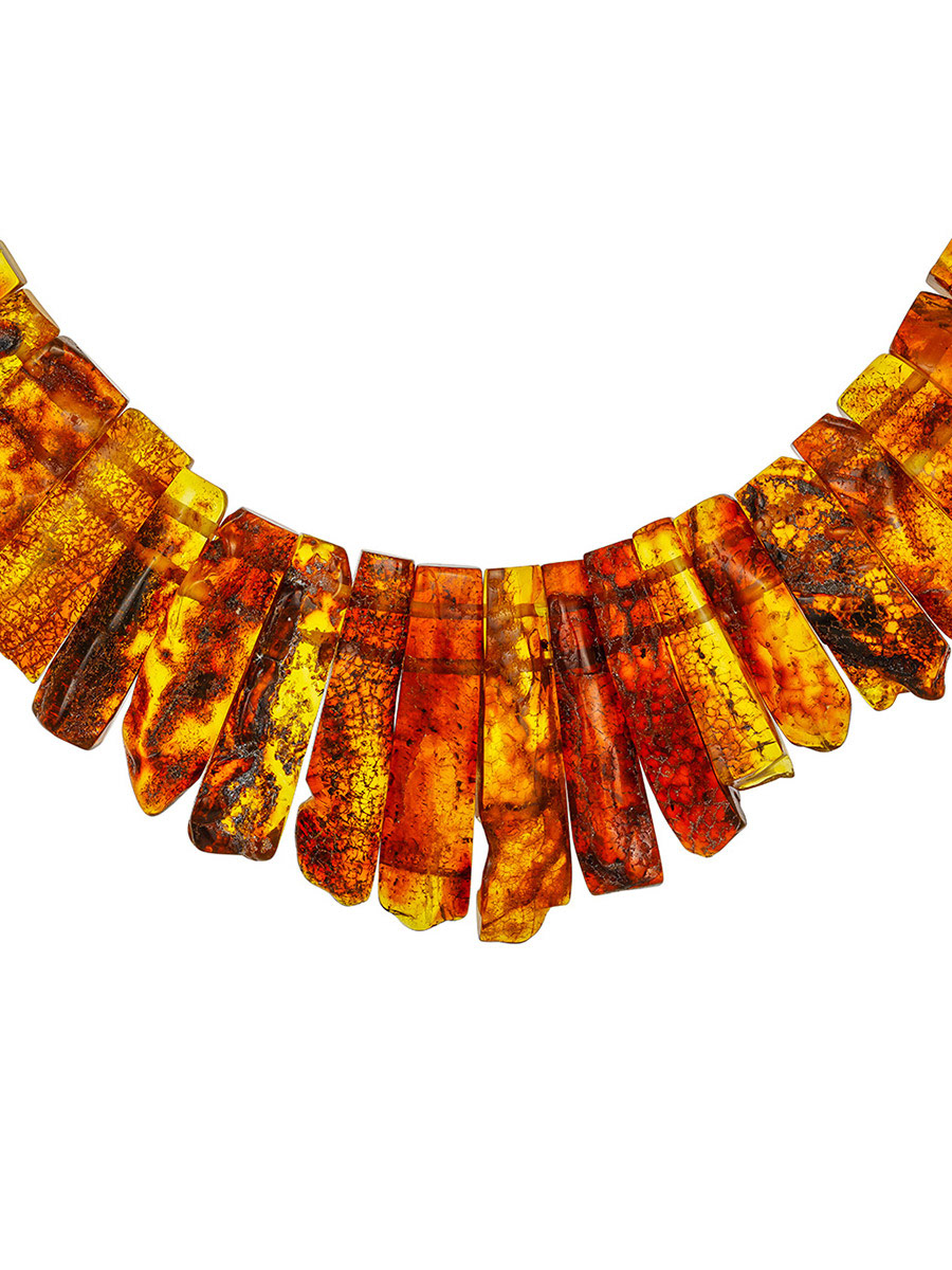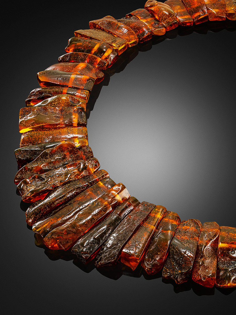 Натуральный балтийский янтарь обладает множеством полезных качеств — издавна известны его лечебные свойства (подробнее о лечебных свойствах янтаря), а также способность положительно воздействовать на эмоциональное состояние и настроение человека. Роскошное колье из нашей коллекции «Помпеи» в полной мере соответствует всем ожиданиям, которые можно предъявить изделию из натурального балтийского янтаря. Крупные пластинки из текстурного камня природной формы подверглись минимальной обработке, благодаря чему они не только сохранили все свои полезные свойства, но и эффектный вид. Такое колье отлично впишется не только в этнические или кантри образы, но и подойдёт к вечернему платью с открытыми плечами.