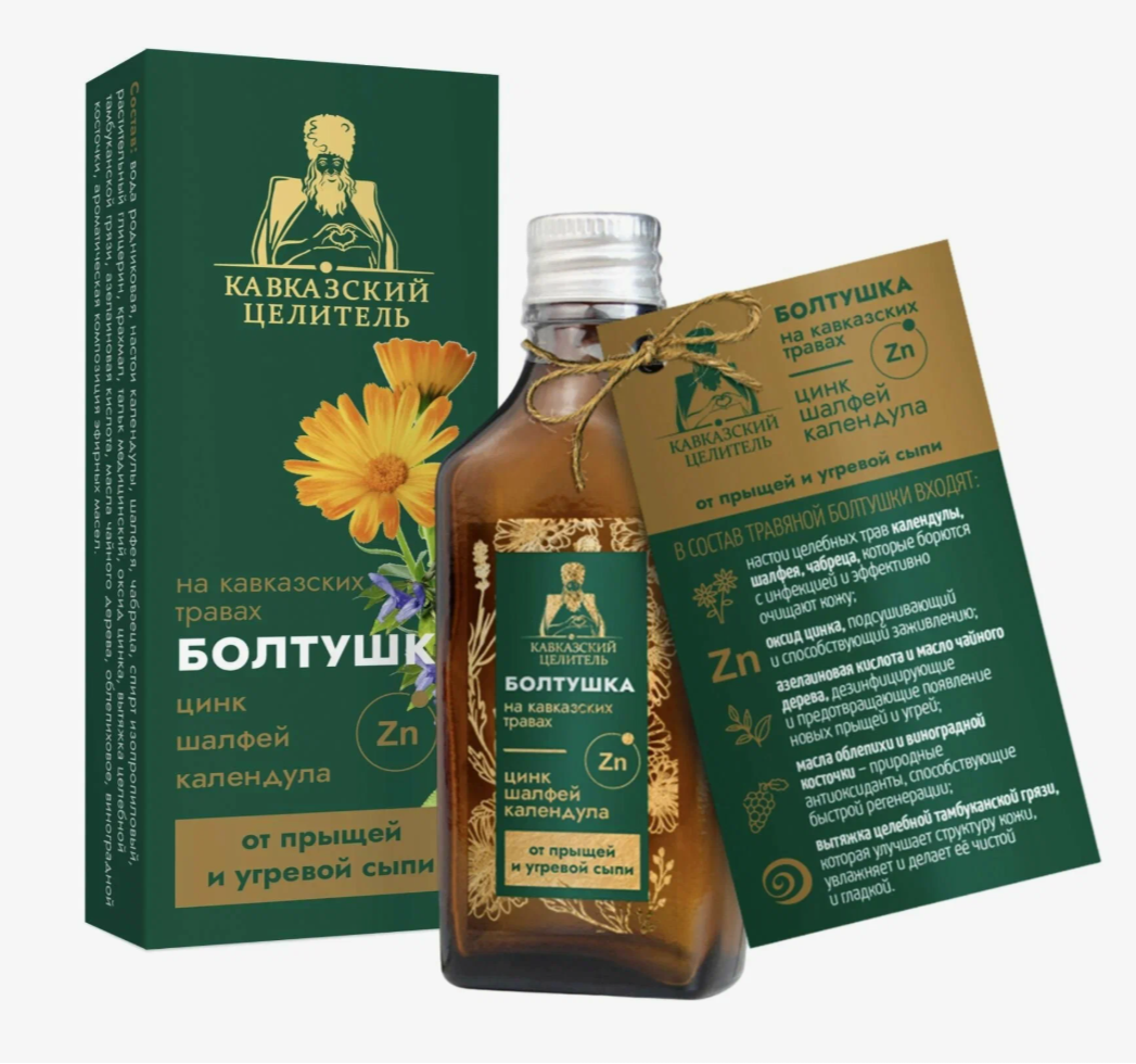 Болтушка на кавказских травах с календулой, шалфеем и цинком — эффективное средство в народной медицине для очищения кожи при проблемах, связанных с нарушением выделения кожного сала: прыщах, угревой сыпи и акне.