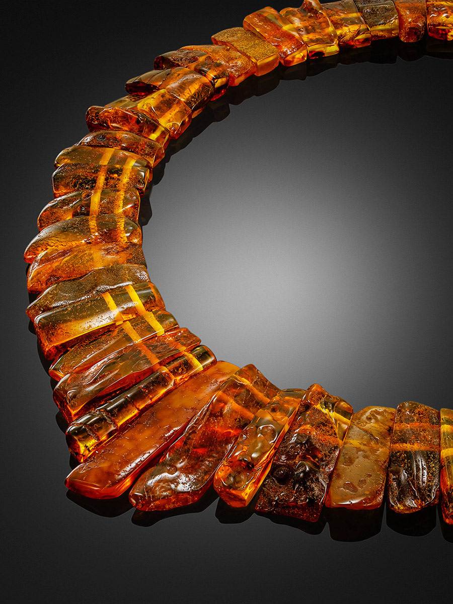 Это сияющее эффектное украшение порадует всех любительниц необычных и броских аксессуаров, поклонниц этнического стиля, а также тех, кто ищет в изделиях не только красоту, но и практическую пользу. Созданное из цельного натурального балтийского янтаря, это колье обладает всеми полезными свойствами, которым так славится янтарь. Оно оказывает положительное воздействие на здоровье (подробнее о лечебных свойствах янтаря), а также позитивно влияет на эмоциональное состояние человека. Такое украшение отлично впишется в этнические образы, а самые смелые особы могут надевать его даже к дополнение к вечерним нарядам с открытыми плечами.