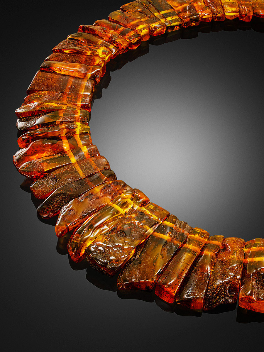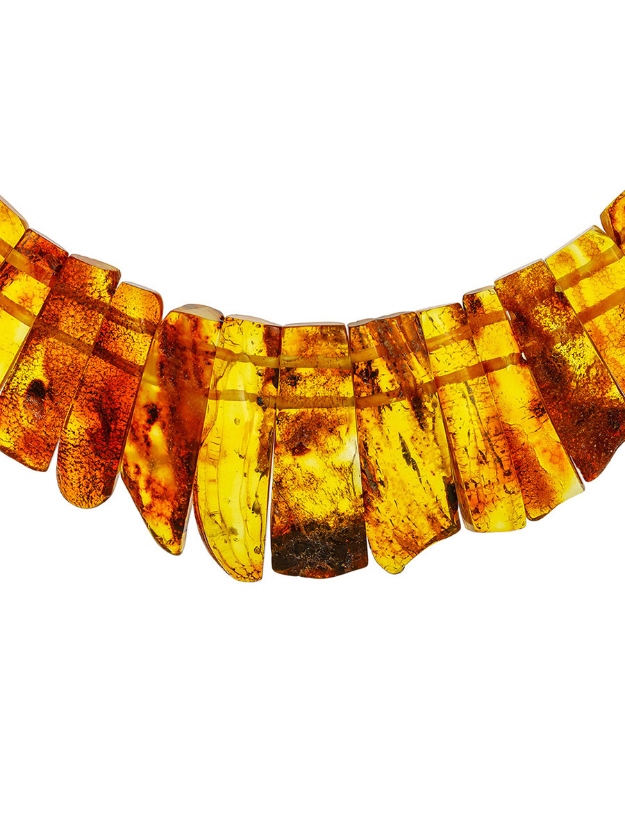 Это оригинальное эффектное колье понравится всем любительницам необычных и броских аксессуаров, поклонницам этнического стиля, а также тем, кто ищет в изделиях не только красоту, но и практическую пользу. Это колье создано из цельных кусочков натурального балтийского янтаря с живописной текстурой и обладает всеми полезными свойствами, которым так славится янтарь. Оно оказывает положительное воздействие на здоровье (подробнее о лечебных свойствах янтаря), а также позитивно влияет на эмоциональное состояние человека. Такое украшение отлично впишется и в повседневные, и в этнические образы, а самые смелые особы могут надевать его даже к дополнение к вечерним нарядам с открытыми плечами.