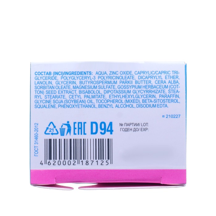 Состав: aqua, zincoxide, caprylic/caprictriglyceride, glycerin, polyglyceryl-3 polyricinoleate, butyrospermum parkii butter, lanolin, dicaprylyl ether, polyglyceryl-3 diisostearate, cera alba, magnesium sulfate, gossypium herbaceum seed extract, bisabolol, dipotassium, squalene, glyceryl linolenate, stearyl stearate, beta-sitosterol, cetylpalmitate, tocopherol(mixed), ethylhexylglycerin, paraffin