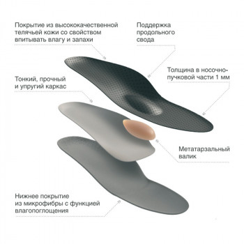 Жесткий каркас из полимерного материала обеспечивает выкладку сводов стопы. Стельки предназначены для использования в повседневной и классической обуви.