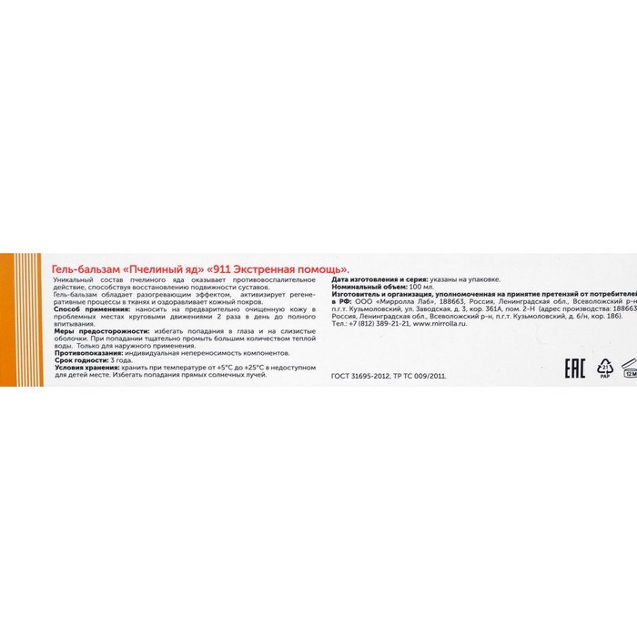 Гель-бальзам для суставов 911 «Пчелиный яд», 100 мл