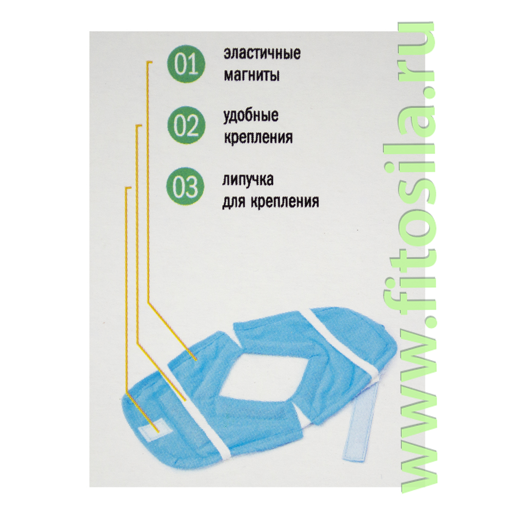 Наколенник магнитоэластичный изготовлен по специальной технологии. В наколеннике расположены 6 эластомагнитов согласно биологически-активным зонам колена. Магнитная сторона эластомагнитов обращена к телу человека. На наколеннике имеется вырез для фиксации коленной чашечки. Наколенник укомплектован гигиеническим чехлом.