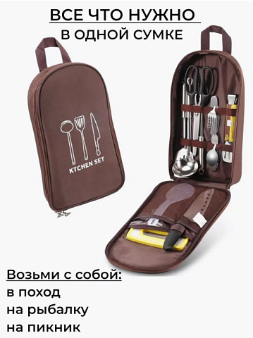 КУХОННЫЕ ПРИНАДЛЕЖНОСТИ В КОМПЛЕКТ НЕ ВХОДЯТ! Сумка для набора посуды туристический – это идеальное решение для активного отдыха на природе, пикника или похода. Основным преимуществом этой сумки является ее компактность и удобство. Молния на сумке позволяет легко и безопасно хранить и транспортировать дорожный набор в походе, на пикнике. Таким образом, вы можете быть уверены, что ваша посуда всегда будет в полной готовности к использованию. Сумка для набора кухонных принадлежностей идеально подходит для кемпинга, походов, пикника, охоты и рыбалки, выживания и полевой армейской кухни. Она также является незаменимым аксессуаром для использования на даче или во время отдыха на природе. Походная сумка для набора посуды станет незаменимым помощником в приготовлении вкусных блюд на открытом огне. Благодаря складному дизайну, сумка занимает минимум места в походном рюкзаке или сумке.