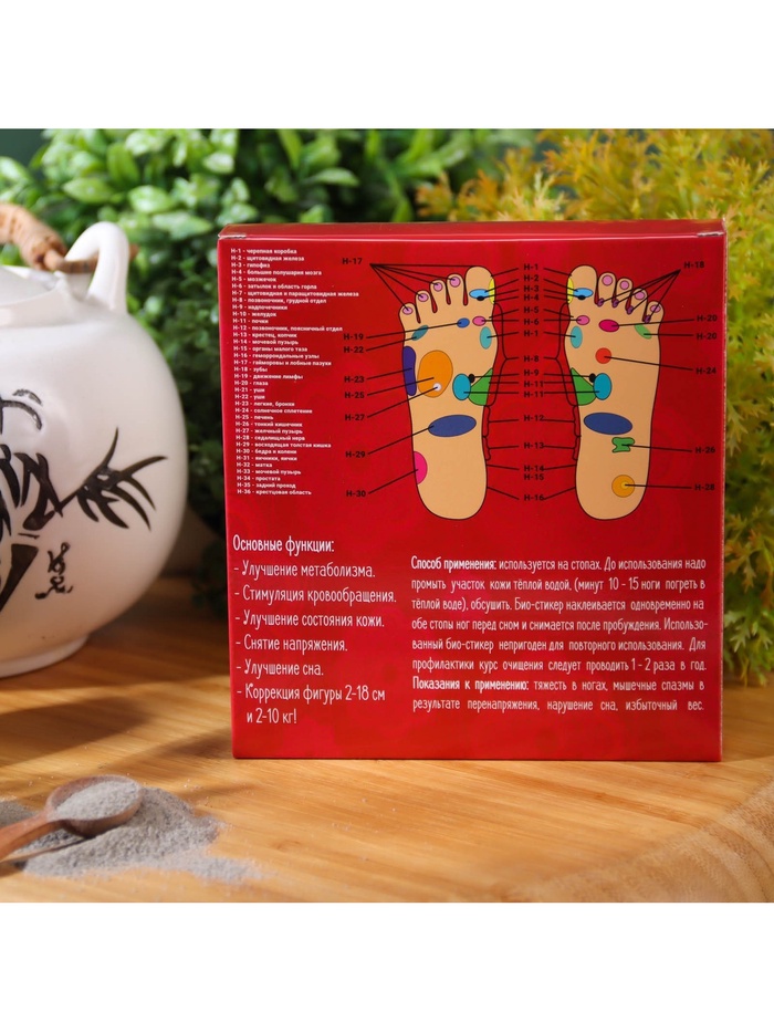 Примечание: пластырь используется на стопах и в больных местах на теле. До использования пластыря надо промыть участок кожи тёплой водой, (минут 10-15 ноги погреть в тёплой воде), обсушить. Пластырь наклеивается одновременно на обе стопы ног перед сном и снимается после пробуждения.