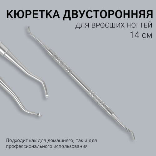 Двусторонняя кюретка длиной 14 см — это идеальный инструмент для маникюра и педикюра, сочетающий функциональность и удобство использования. Благодаря эргономичному дизайну и ребристой поверхности ручки, инструмент удобно ложится в руку, предотвращая скольжение, что делает процесс ухода за ногтями безопасным и точным.