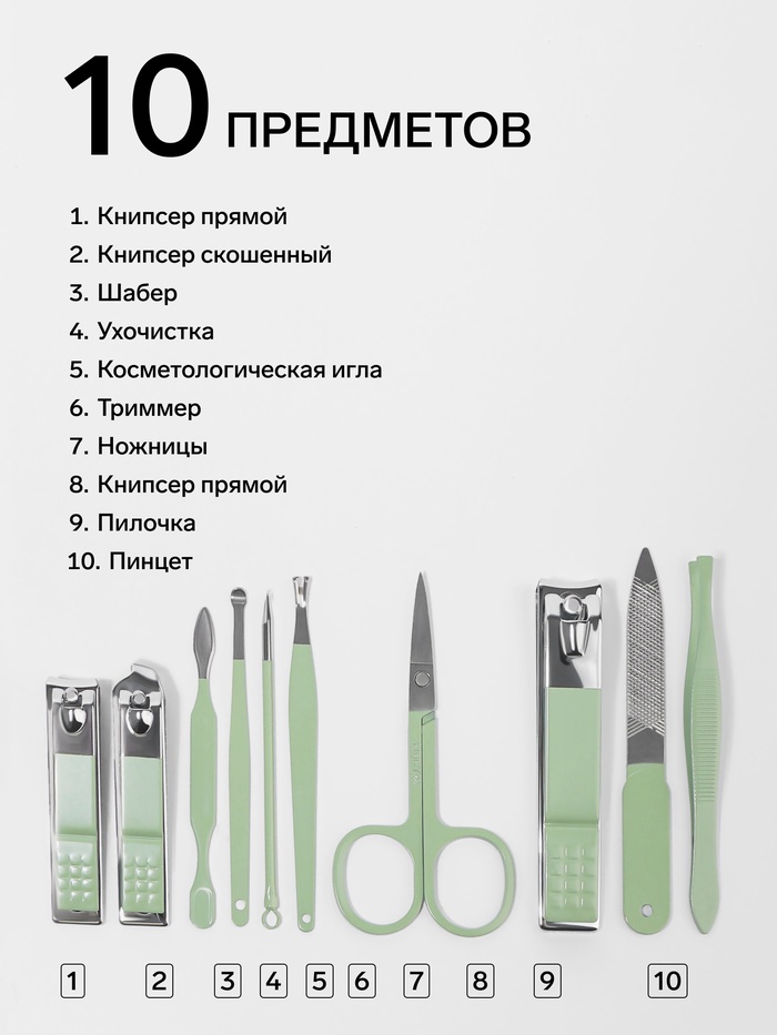 * 10 функциональных инструментов: пинцет, ножницы, пилка, книпсер, шабер, триммер, ухочистка и косметологическая игла.