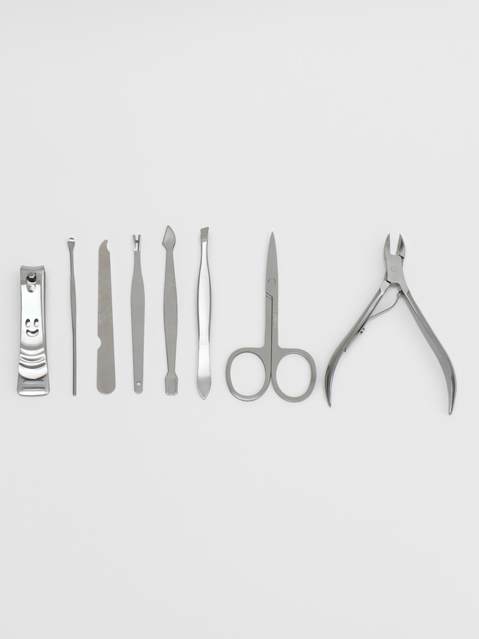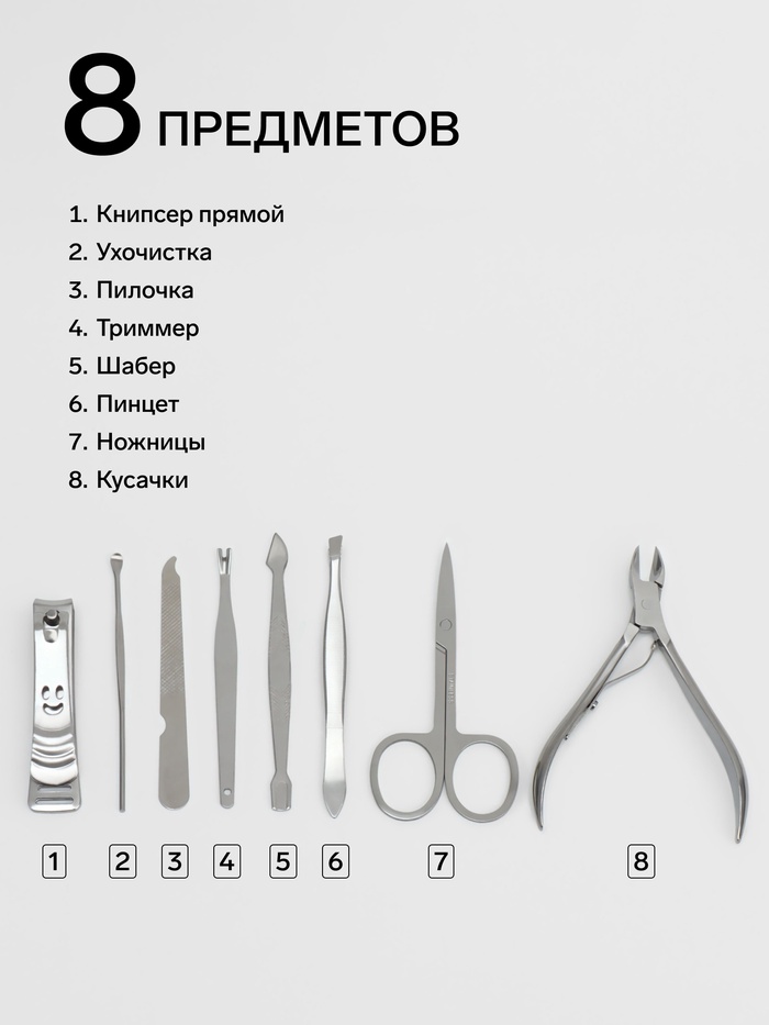 Составляющие набора: Пилка, Триммер, Шабер, Пинцет, Книпсер, Кусачки, Ухочистка, Ножницы