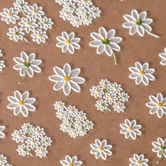 Изготавливаясь из качественных пластиковых и бумажных материалов, наклейки обладают эффектом 3D, что придаёт вашим ногтям выразительный и объемный вид. Белые цветы ромашек на фоне натурального оттенка создают яркий и свежий акцент, который станет отличным дополнением как к повседневному, так и к праздничному образу.