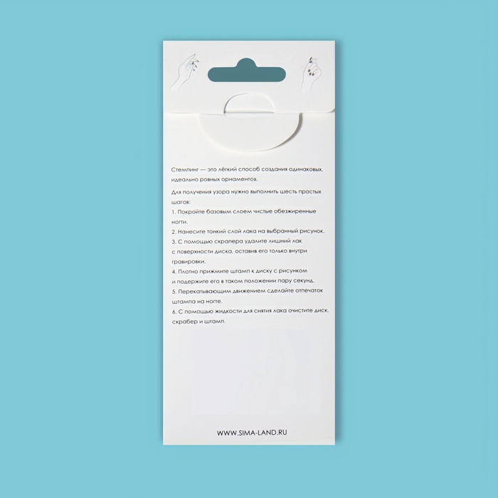 Размер: 12 см х 6 см. Перед использованием нужно снять защитную синюю пленку. Диск представляет собой прекрасный инструмент для декора ногтей, который способен дополнить любой повседневный маникюр. Стемпинг ногтей рекомендуется делать с помощью специального гель лака, штампа и лопаточки. Этот продукт поможет вам создать уникальные узоры, которые будут выглядеть стильно и притягательно.