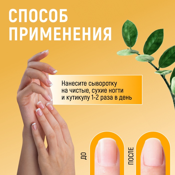 * Легкость в использовании: Наносите сыворотку на чистые и сухие ногти и кутикулу один или два раза в день. Легкая текстура быстро впитывается, не оставляя жирной пленки.