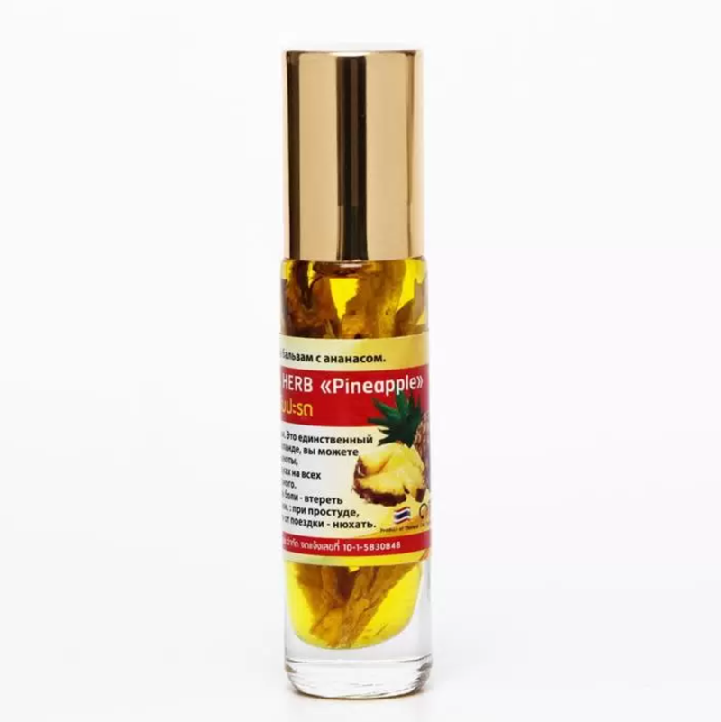 Banna Oil Balm With Herb Pineapple – это тайский жидкий бальзам с эфирными маслами и ананасом, популярное натуральное средство от укачивания, головной боли и насморка, очень приятно пахнущий и дополнительно настоянный на свежем ананасе.