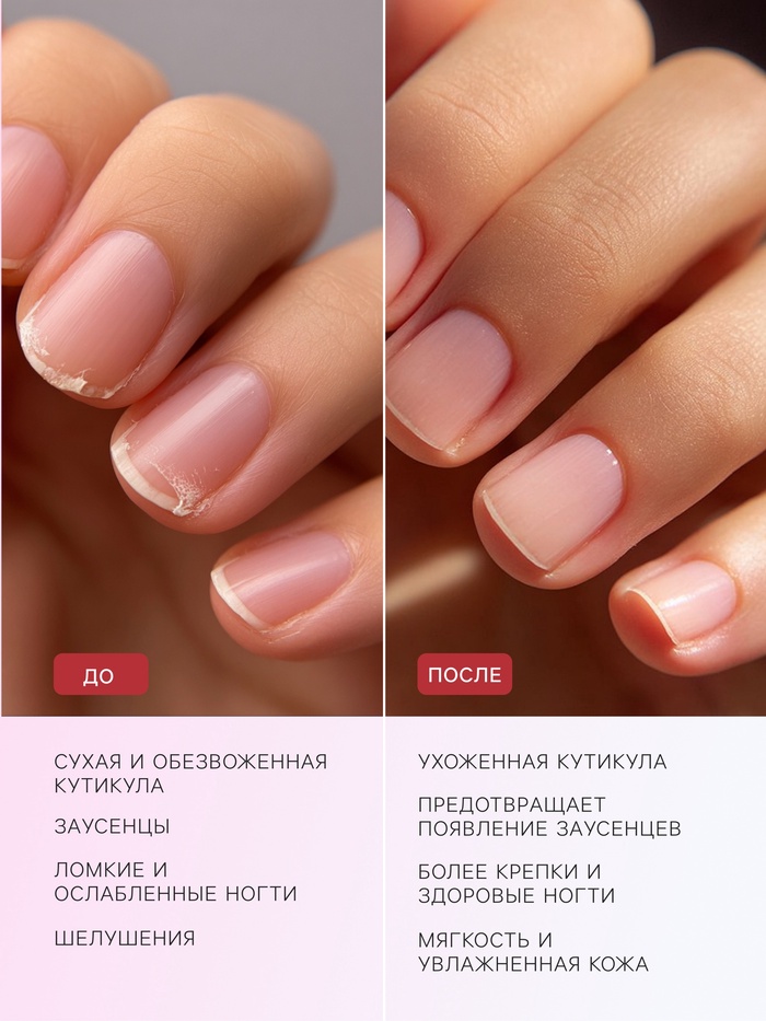 * Содержащиеся в составе натуральные фруктовые масла, кальций, витамины и кератин защищают и увлажняют кутикулу.
