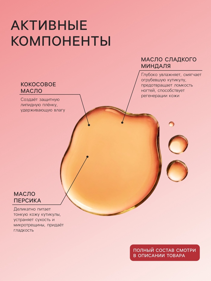 Незаменимое средство для кутикулы. Композиция из масел сладкого миндаля, кокосового масла, масла персика и чайного дерева глубоко увлажняет и питает кожу, восстанавливая ее и предотвращая избыточное нарастание кутикулы. Масло идеально подходит для хрупких и тонких ногтей. Экстракт ананаса известен своими укрепляющими и антисептическими свойствами. Кроме того, он предотвращает ломкость, придает ногтям блеск и ухоженный вид. Экстракт Монарды обладает мощным бактерицидным действием, оказывает противовоспалительное, антиоксидантное, адаптогенное, антиканцерогенное и высокое консервирующее действие.