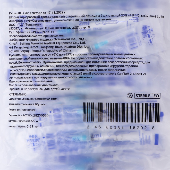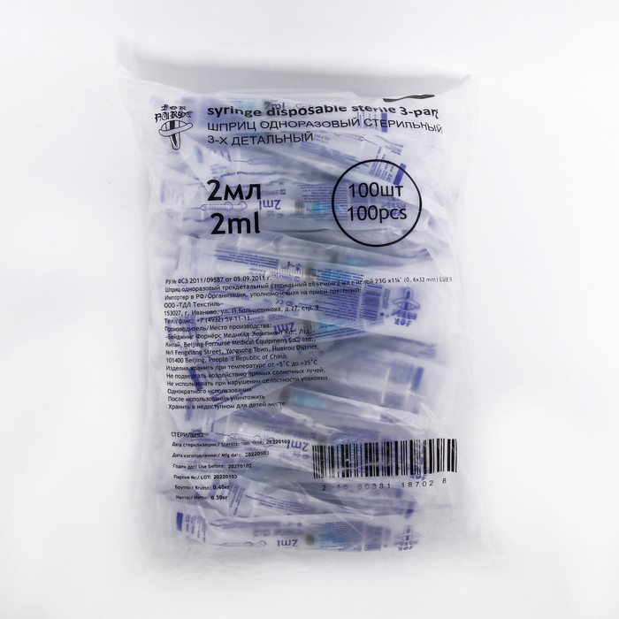 Шприц 2.0 мл трехкомпонентный с иглой 23G Хуайань