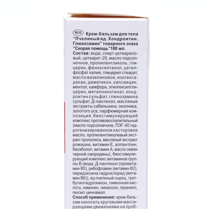 Состав: вода, спирт цетеариловый, цетеарет-20, масло подсолнечное, пропиленгликоль, глицерин, феноксиэтанол, цетилфосфат калия, глицерил стеарат, масло вазелиновое, изогексадекан, диметикон, капсаицин, ментол, камфора, этилгексилглицерин, метилникотинат,  хондроитин сульфат, глюкозамина сульфат, Д-пантенол, масляные экстракты сабельника, окопника, золотого уса, парфюмерная композиция, рибофлавин, пиридоксина гидрохлорид, яд пчелиный сырец, трет-бутилгидрохинон, лимонная кислота, лимонен, линалоол, гераниол, гексил циннамал.