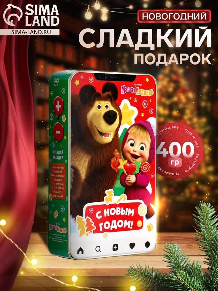 * Новогоднее оформление: Коробка украшена изображениями Маши и Медведя в зимних сценах. Дизайн передает атмосферу зимних праздников.